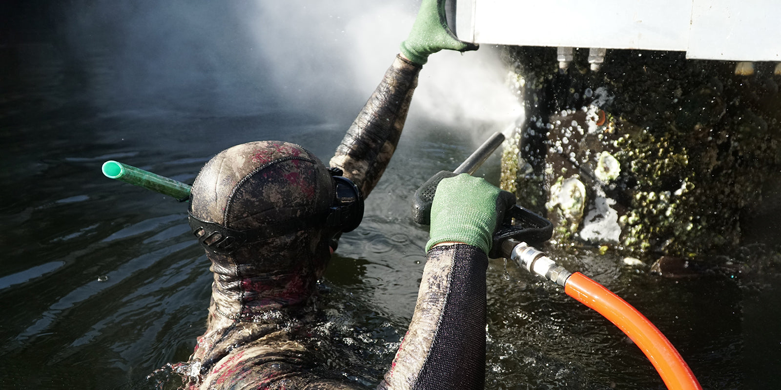 This form of cleaning is a process that uses high-frequency sound waves to create microscopic bubbles in water, which then implode on the surface of the object being cleaned, removing dirt, grime, and other contaminants. This type of cleaning can be highly effective for removing marine growth, such as barnacles and algae, from the hull or structure.